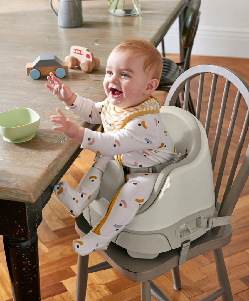The Bug 3-in-1 seat is the perfect way to keep your little one entertained and safe once they have learned how to hold up their head. With removable and adjustable features, it provides a comfortable place for them to sit while you take care of other tasks. Plus, its play tray comes with colorful sensory toys that will help stimulate their minds. The Bug high chair has a super-stable base, making it ideal for both playing and weaning. You can use the high chair as a booster seat while your child is learning to eat solid food, then strap it onto an adult dining chair when they are ready to join you at the table. This versatile design saves you from having to buy another product once your toddler grows up.