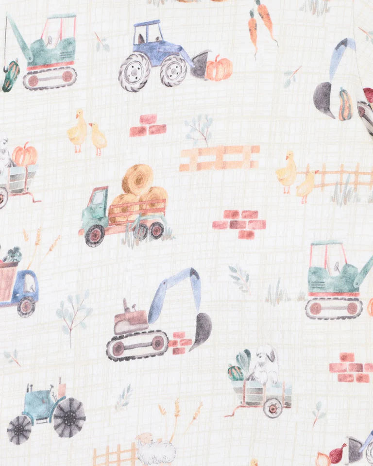 Bring a touch of countryside charm to their everyday wardrobe with our Clayton Henley Bodysuit, crafted in 100% organic cotton for softness and breathability. This sweet little piece features a delightful farm-themed print, showcasing animals, hay bales and tractors, perfect for curious little adventurers. The henley-style button placket and press stud crotch opening make dressing and changing a breeze.