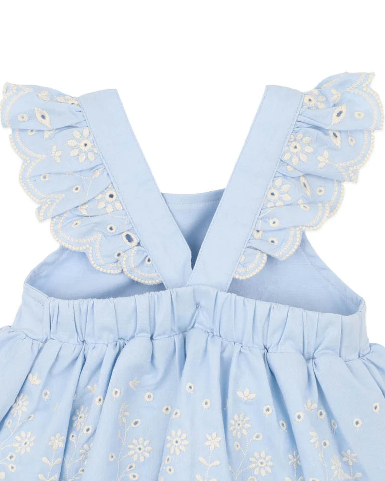 A little outfit made for memory-making days. With sweet scalloped embroidery and delicate shoulder frills, this sky-blue overlay dress romper is a picture of classic charm and playtime comfort. Whether it's a picnic in the park or a family celebration, your little one will look oh-so-lovely.