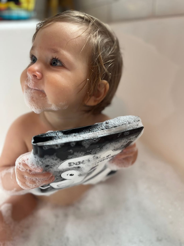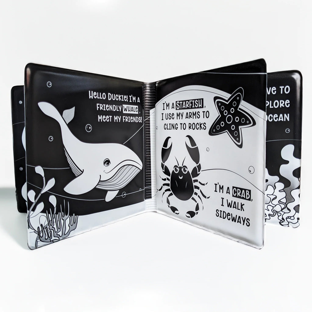 Duckie Goes On An Adventure is a waterproof black and white bath book to help with babies vision development. Research has shown that high contrast black and white images help improve your baby's vision and cognitive skills. When babies are first born, their eyesight is not fully developed and they have trouble distinguishing between colors. Black and white images, on the other hand, provide a clear, high contrast visual that is easy for babies to focus on and process. This can help to stimulate their developing brain and improve their ability to recognize patterns and shapes.