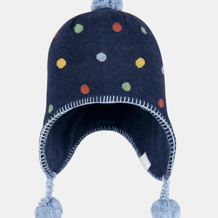 Toshi Earmuff Magic is crafted from the finest quality certified 100% organic cotton yarn. Organic certification ensures the beanie is gentle on heads, as well as our precious environment. The beautifully-textured melange yarn brings an element of refinement to the beanie. This beanie features ear flaps for cosy and nurturing protection from the elements. A vibrant jacquard polka dot design creates a fun and playful style. Pom poms introduce a cute and whimsical feel. The baby beanie Earmuff Magic is fully lined for enhanced comfort and greater warmth during our cooler months.
