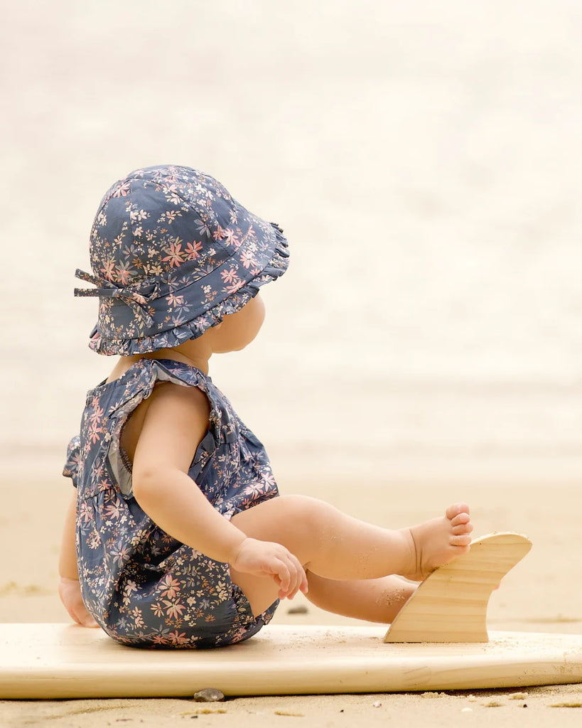 Toshi Bell Hat Eva is a flattering and feminine bell shaped hat. A UPF 50 + UV rating is provided in colourway Sunny. The baby sunhat is crafted from the finest quality 100% cotton. The head tie offers adjustable sizing and a chin tie secures the hat. The sunhat is fully lined for increased comfort. Pretty styling is created with a softly frilled border.