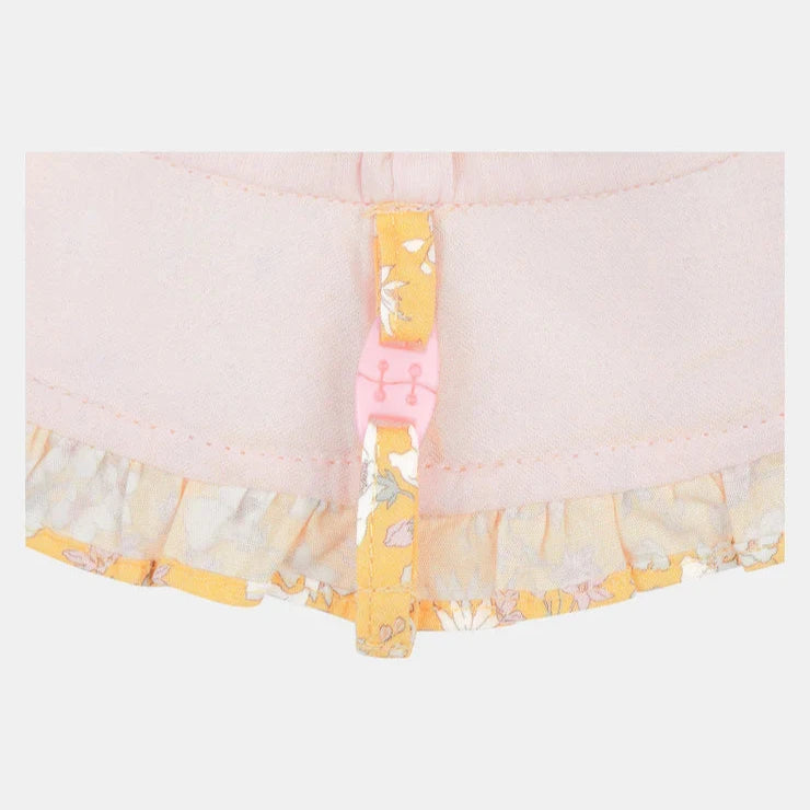 Toshi Bell Hat Eva is a flattering and feminine bell shaped hat. A UPF 50 + UV rating is provided in colourway Sunny. The baby sunhat is crafted from the finest quality 100% cotton. The head tie offers adjustable sizing and a chin tie secures the hat. The sunhat is fully lined for increased comfort. Pretty styling is created with a softly frilled border.