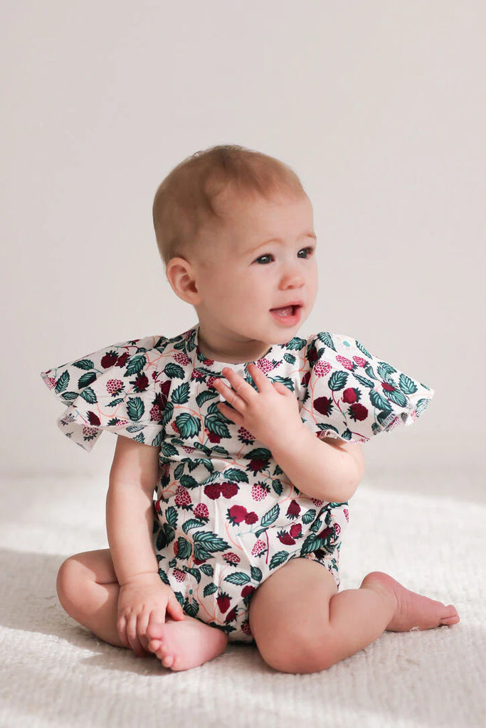 Crafted from 100% organic cotton poplin, the boysenberry prints features rich red berries, soft blossoms, and lush green vines on a pale blush background, creating an elegant yet playful look. With a relaxed fit and breathable fabric, this romper is perfect for little ones on the move. Designed in New Zealand and ethically made in India, it’s a beautiful and sustainable addition to any wardrobe.