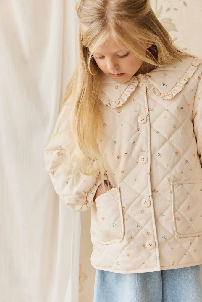 Wrap your little one in warmth and whimsy with the Kora Jacket in Sweet Magnolia, a beautifully quilted puffer jacket featuring delicate floral details on a soft pinky-peach base. With a charming frill collar, front buttons, and two handy pockets, this jacket is as practical as it is pretty – perfect for layering on cooler days.