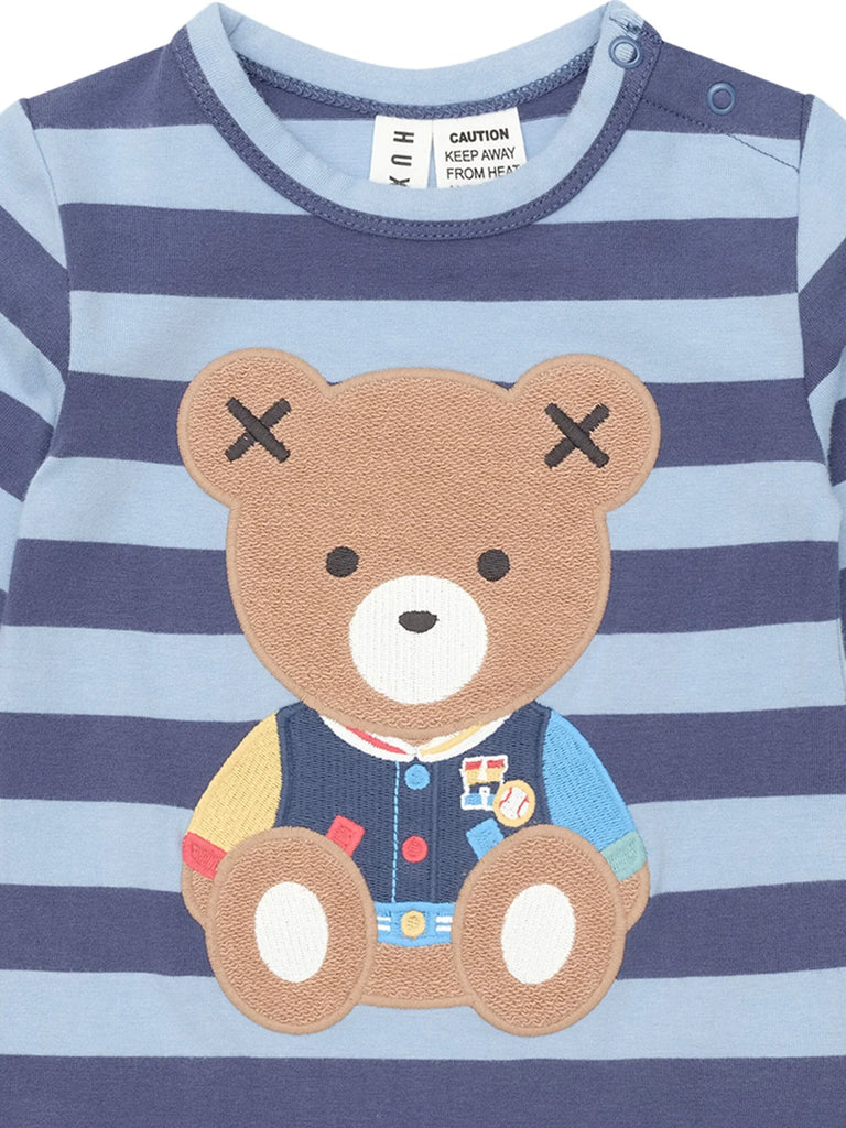 A marshmallow-soft striped romper with fun and furry Huxbear embroidery. Consciously crafted from premium organic cotton, it has stainless steel snaps at the shoulder and crotch for super snappy dressing. Just add squishy legs.