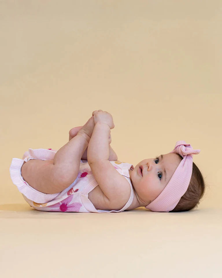A sweet summer staple, this cotton knit romper is made for sunshine days and garden adventures. With its cheerful floral print design with boucle embroidery, soft pink base and sweet frill trims, it's as playful as it is comfy. Just add a sunhat and bare feet for the ultimate baby look.