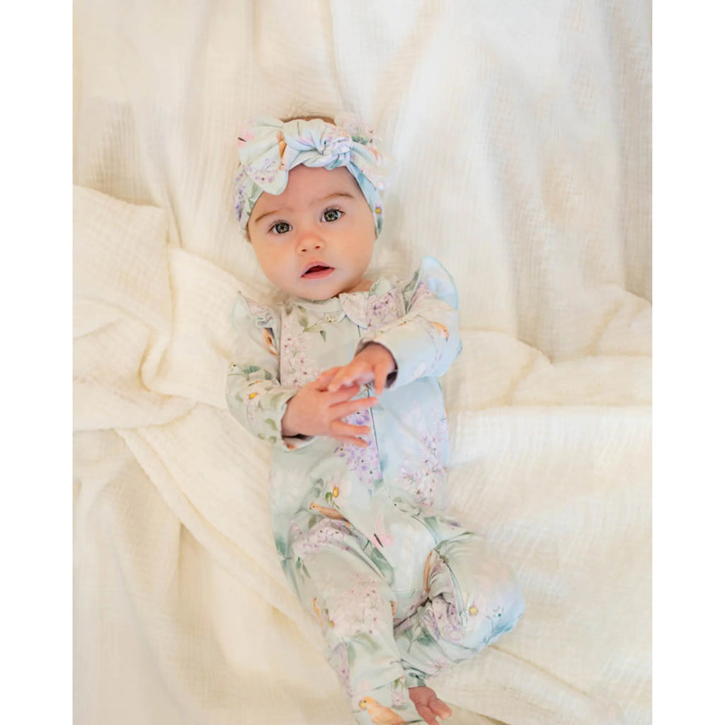 Drift off to dreamland among fluttering butterflies and chirping birds in our beautifully detailed Garden Friends zipsuit. Adorned with an exclusive Bébé by Minihaha print, this full-length romper is a gentle nod to spring mornings and garden discoveries. Crafted in soft, stretchy cotton elastane jersey, it ensures all-day comfort for wriggly little explorers. Delicate shoulder frills add a playful flourish, while practical fold-over cuffs and fold-over feet keep tiny hands and toes snug and secure. Complete the look with the Madelyn print headband for an adorable outfit from head to toe.