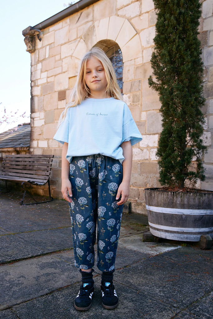 The chicest trousers around, the Mary Pant is designed to enhance your little one’s wardrobe. Featuring a delicate watercolor blue hydrangea print on a classic French navy background, these pants showcase a stylish elastic paperbag waist for a comfortable fit and a relaxed silhouette. Crafted from textured cotton, they provide breathability and style in one.