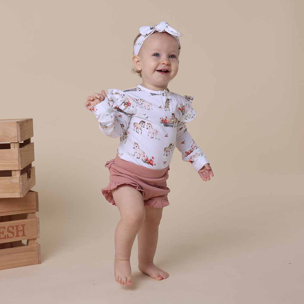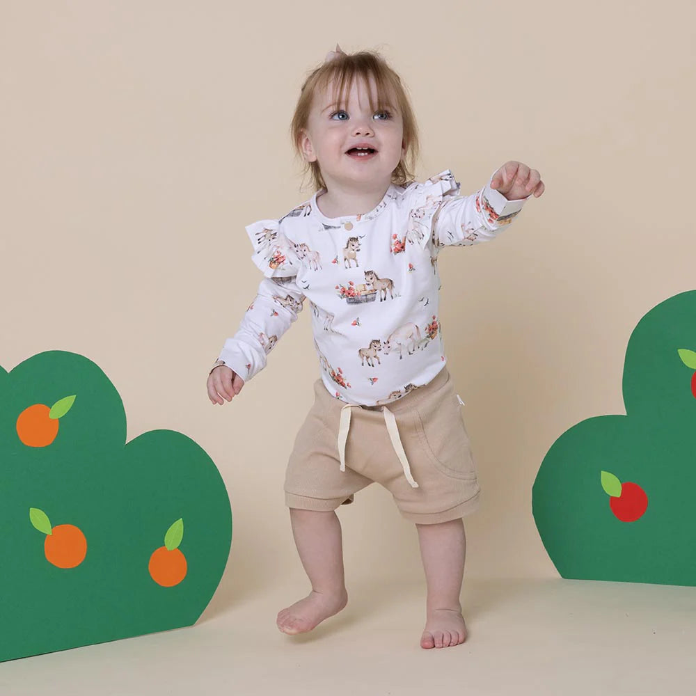 Soft and stretchy, our bodysuits are easy-care and coordinate well with our pants and shorts. This Pony Pals bodysuit matches beautifully with our Biscuit, Chestnut and Pebble rib.