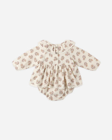 Our Thalia Romper features a sweet collar, delicate lace trim, a gathered waist, coconut buttons down the back, and bottom snaps for easy changes.