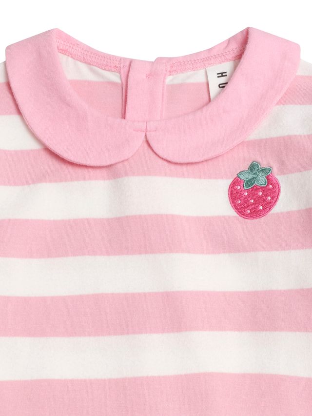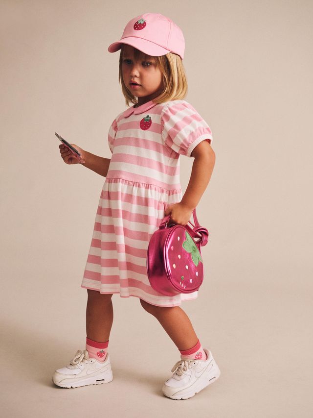 The perfect everyday dress, upgraded. Made from soft organic cotton jersey, this pretty pink number features sweet puff sleeves, a peter pan collar and an embroidered chest strawberry. Features buttons down back for easy dressing. Play the day away.