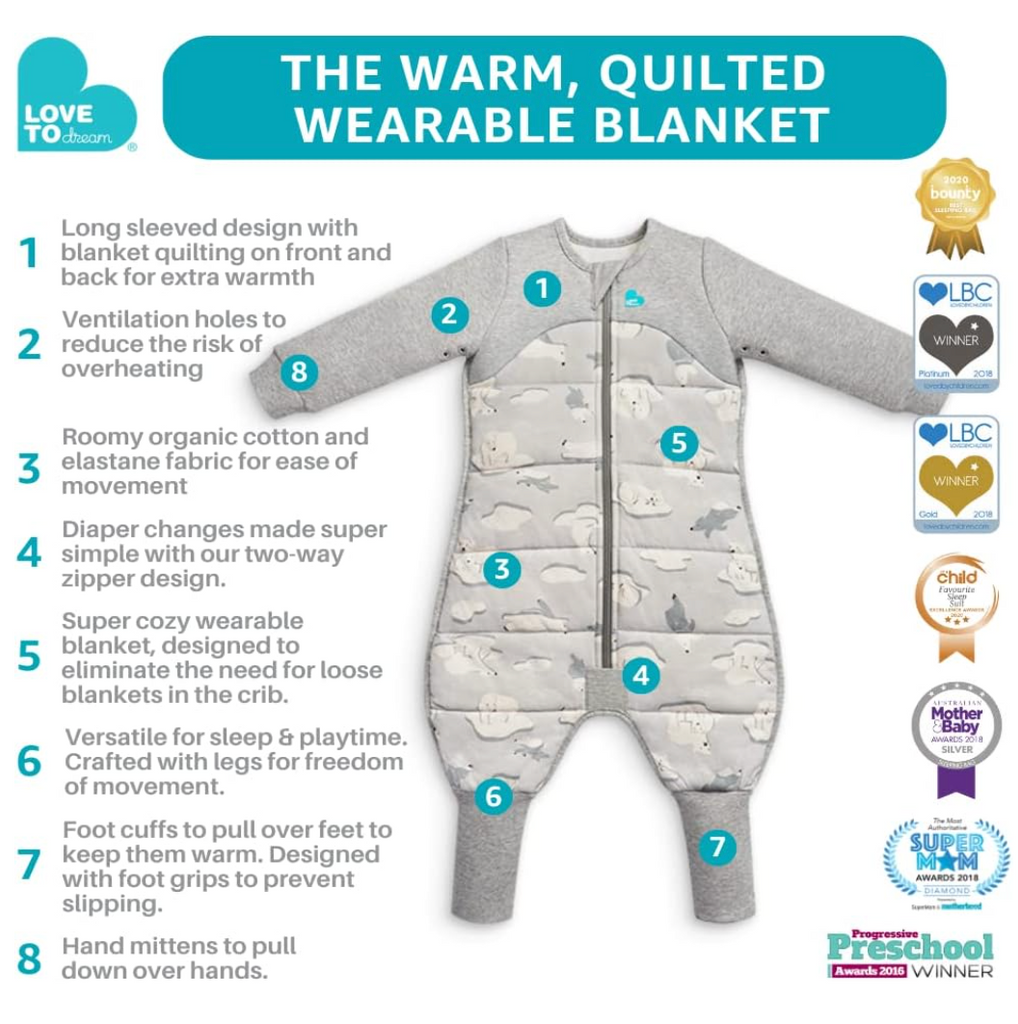 The award-winning Love To Dream Sleep Suit™ is a versatile “all-in-one” style wearable blanket with legs. Designed to keep little ones warm, whilst providing freedom of movement. Perfect for little wrigglers.Very versatile; can be used for sleep, play or on-the-go