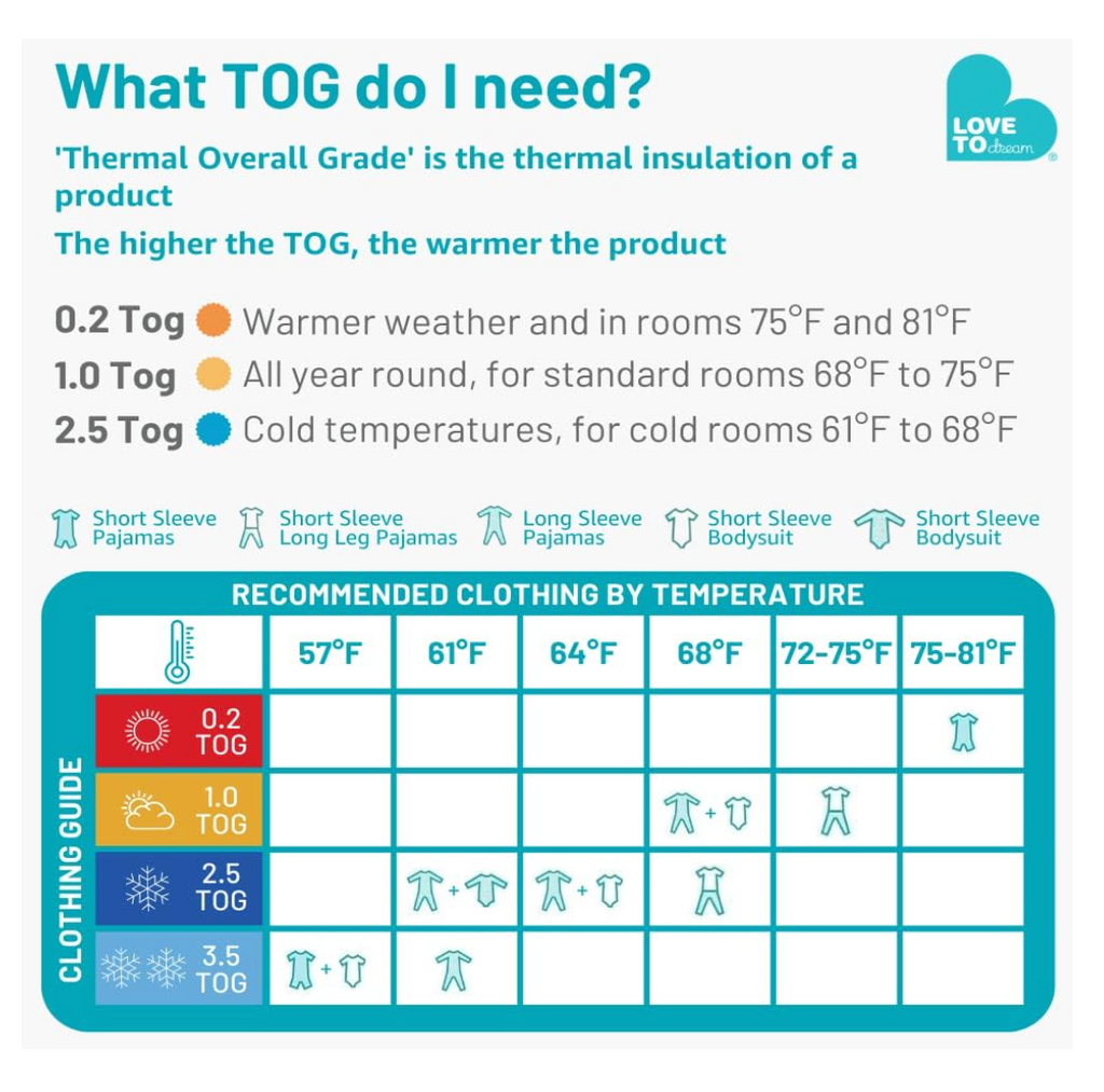 Do not soak or bleach, iron zipper or dry cleanTOG stands for 'Thermal Overall Grade', which is a unit of measurement used to calculate the thermal insulation of a product, usually in the textile industry. Our sleep garments are given a TOG rating according to the warmth they provide. Basically, the higher the TOG, the warmer the product. Note, a higher TOG rating doesn’t necessarily mean a thicker garment.