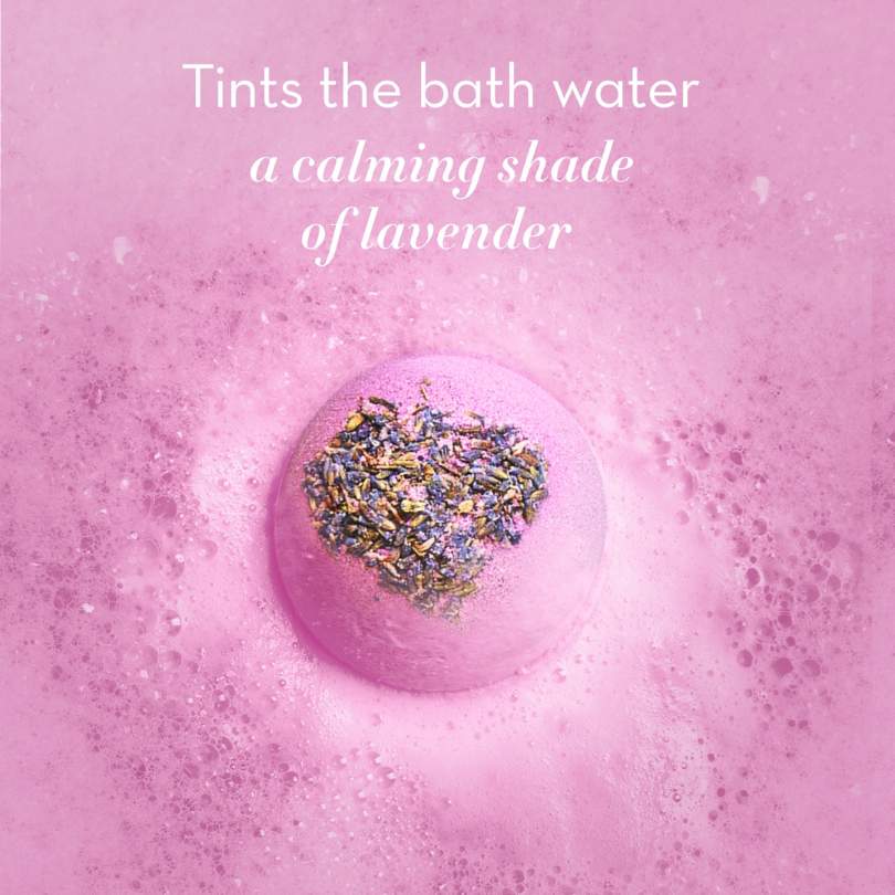 - This luxurious relaxing bath bomb tints the bath water a calming shade of lavender.