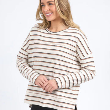 The Berkley Stripe Tee is all about fun and flair, with bold stripes and a cool raw edge detail that adds an extra kick. Its round neckline and long sleeves keep it classic, while the modern twist makes it anything but ordinary.
