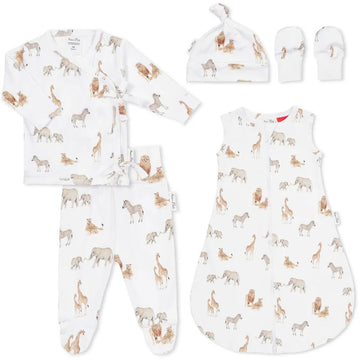 With everything you need in one convenient package, this set is designed to make bedtime to daytime a breeze. Crafted from certified 100% Organic Cotton, these items are safe, gentle, and irresistibly soft on baby's delicate skin. The set includes a 1.0 TOG sleeveless Sleeping Bag, Knot Hat, Kimono Top, Footed Pants, and Mittens.