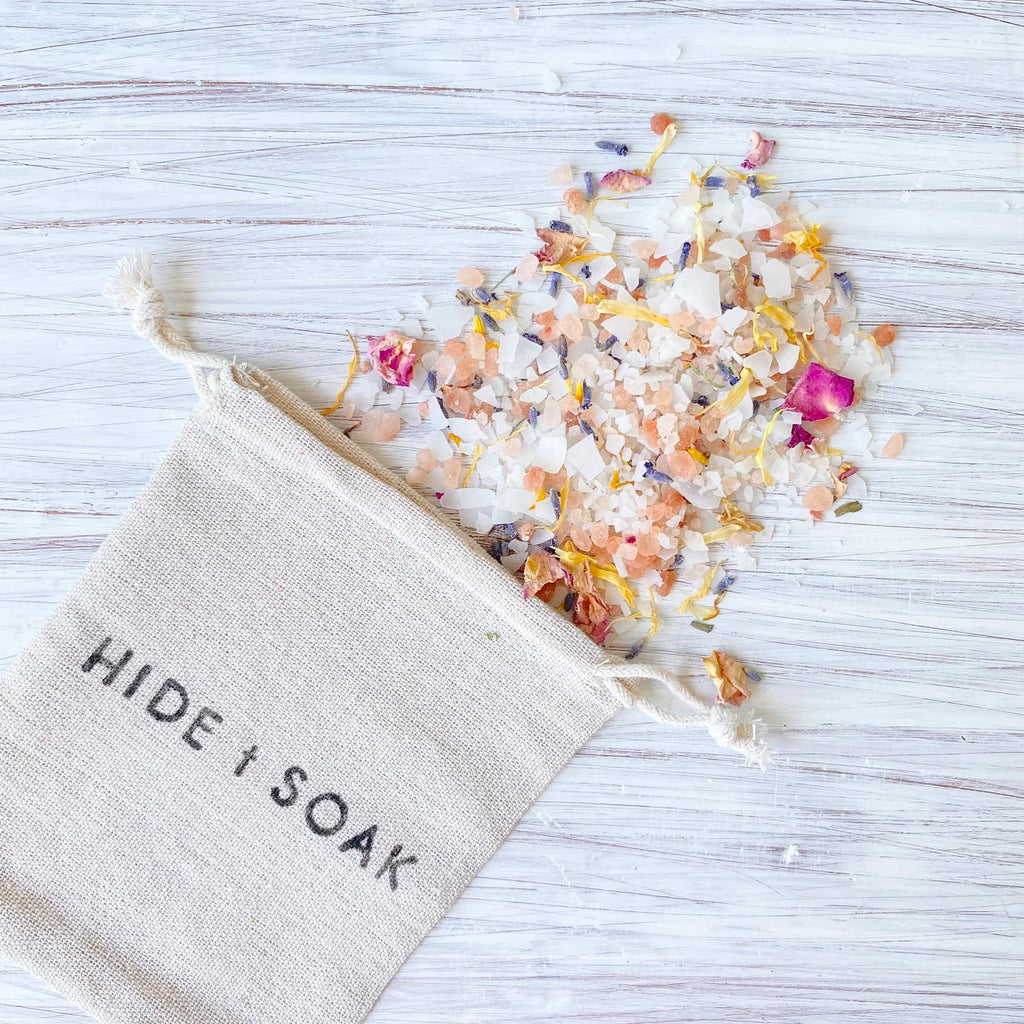Hide + Soak with our luxury botanically infused magnesium bath salt soaks.