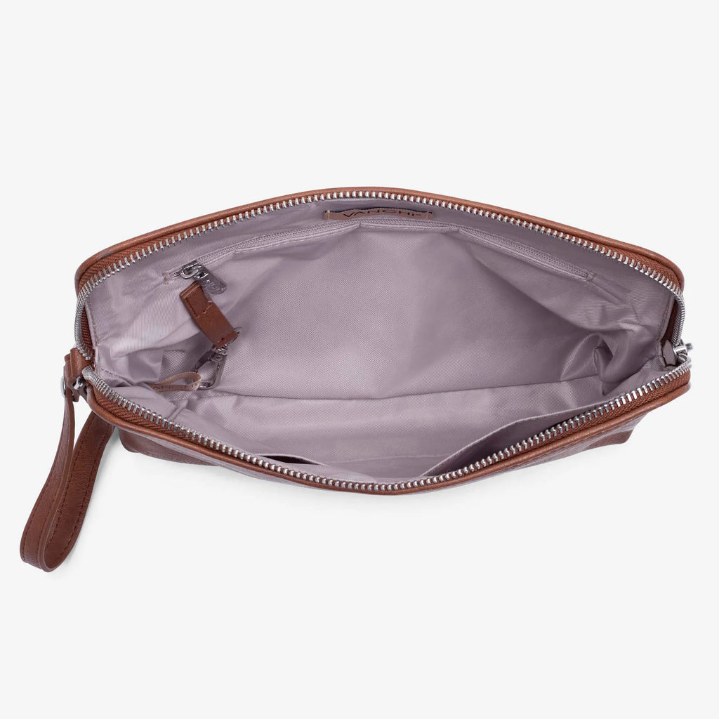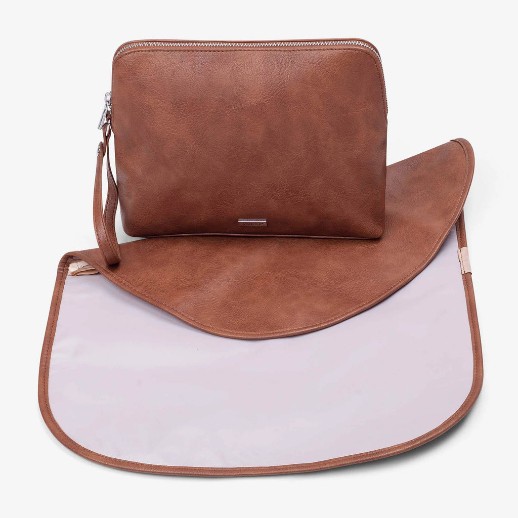 With 3 internal pockets including a zippered privacy pocket, the Everything Pouch is surprisingly spacious. It comes with a wristlet that you can hang from a pram or bag, and you can add matching wipeable vegan leather activity mat that fits perfectly inside.