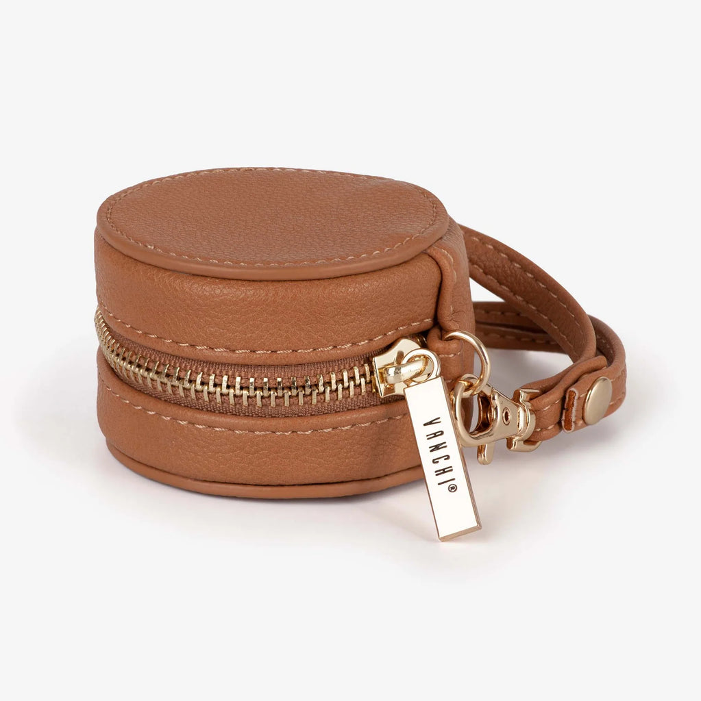 The zippered VANCHI Keep Safe Dummy Saver - Circle Camel is ideal for keeping your little one's soother/dummy, your precious small items (such as airpods!) or other small items safe, hygienic, and close at hand.