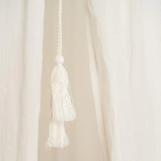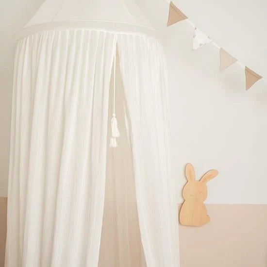 The mosquito net comes in beautiful colours and pairs beautifully with our textile collection and rugs. The light fabric features hoop and the top has a cord for easy attachment. The two small tassels add a little extra detail, but you can also decorate the mosquito net with a dreamcatcher, mobile or something homemade like a garland. Make sure the mosquito net hangs securely and take your baby’s development into account to avoid your child getting tangled in the fabric. A mosquito net is nice for a baby because it provides a sense of security. It also looks good in baby’s room. The mosquito net comes in many different colours, so there is always one that matches your baby’s room.