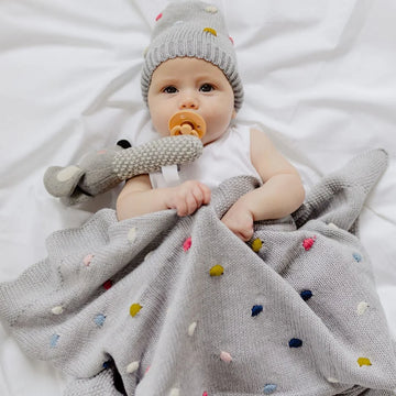This ribbed knit blanket is made from 100% premium quality cotton in versatile and gender-neutral Grey with multi-coloured bobbles sprinkled all over it. It measures 80x100cm and is machine-washable.