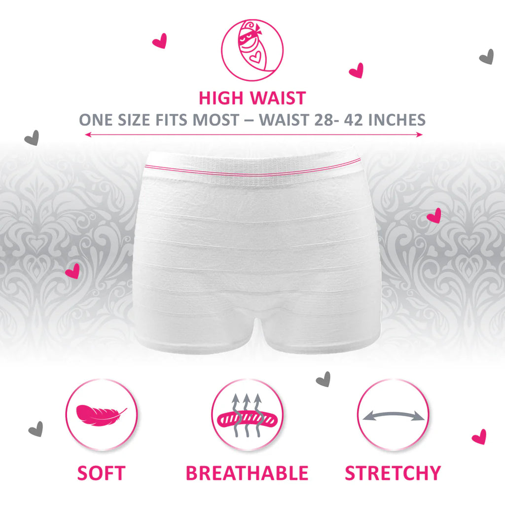 - Comfort and Convenience! ! Our pretty postpartum boy shorts style underwear is stretchy, soft and breathable to give new Mamas the comfort they need their during their recovery. Whether a natural or C section birth your Ninja Mama disposable underwear will provide soft comfort for those tender areas. One Size Fits Most Mamas (28 - 42 inch waist) 96% Polyester 4% Spandex -