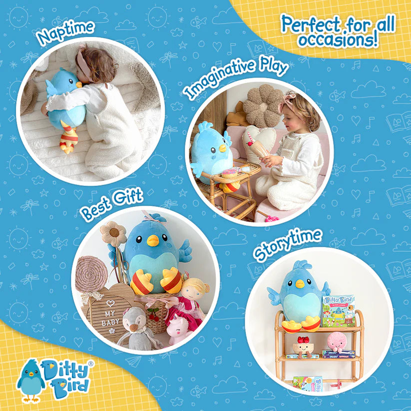 - Perfect for playtime, storytime, naptime and bedtime: Size for cuddly adventures, at 12 inches tall, this Ditty Bird plush toy is the perfect size for hugs and playtime fun, doubling as a cuddly companion for storytime or any imaginative journey.