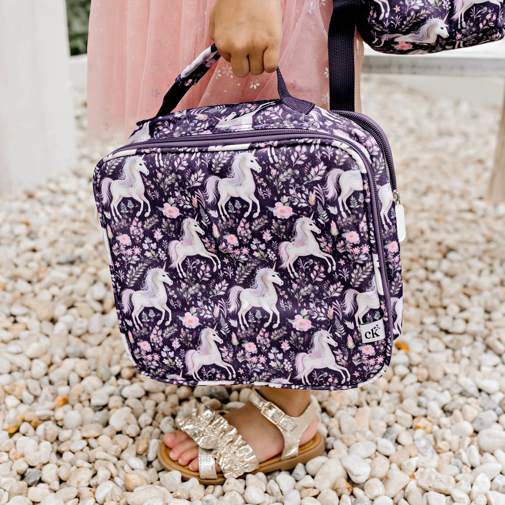 Add a little sparkle to lunchtime with our Magical Unicorn insulated lunch bag. Featuring soft cream unicorns and whimsical florals on a rich purple backdrop, it's perfect for dreamers who love a touch of magic with every meal.
