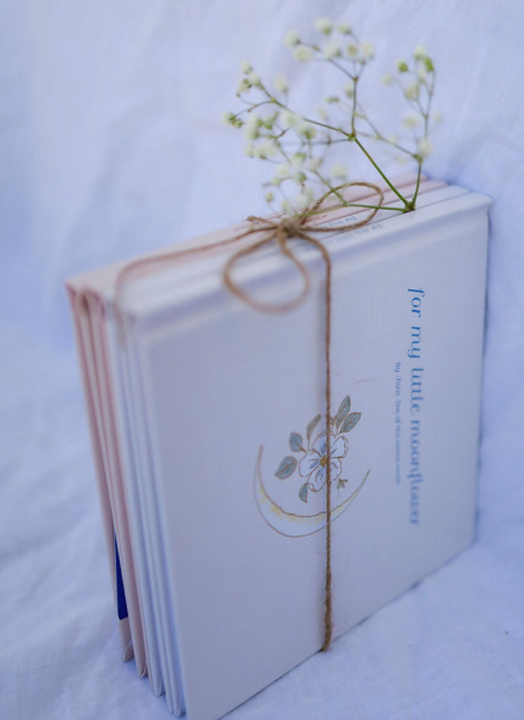 Our book contains 32 pages of beautifully illustrated images and is a story you will want to read over and over. there is a dedication page at the front of the book for you to write the name or names of your moonflower, as well as a double page spread at the back for you to write your own words, place photos, prints and record special details.