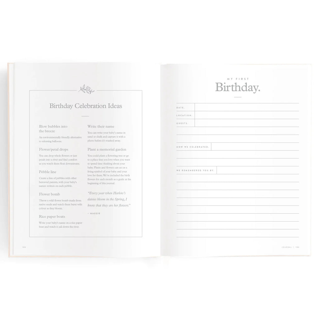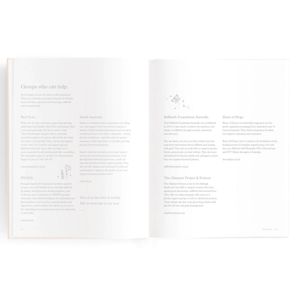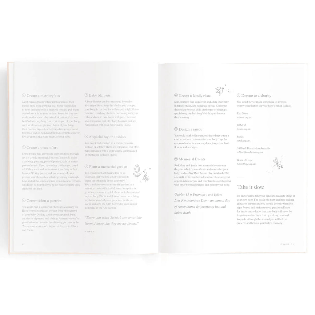 This journal has four parts - Mementos, Healing, About Me and Journal. It's designed to honour their little one's memory and also be guided through their grief. Also available in a beautiful keepsake box where you can place personal items such as a lock of hair, photos, hospital tags and cot cards or pressed flowers.