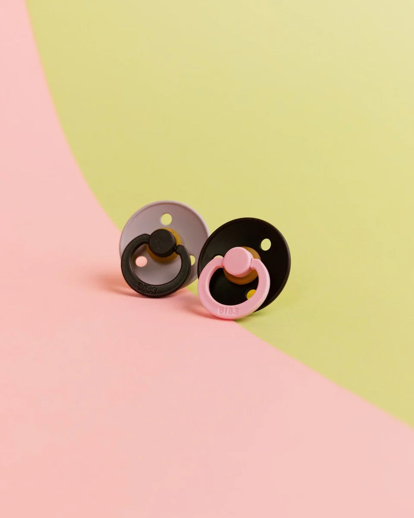 BIBS Colour pacifier is the original BIBS pacifier and has been on the market for over 40 years. It has the signature round BIBS shield with three vent holes and round BIBS engraved handle ring.