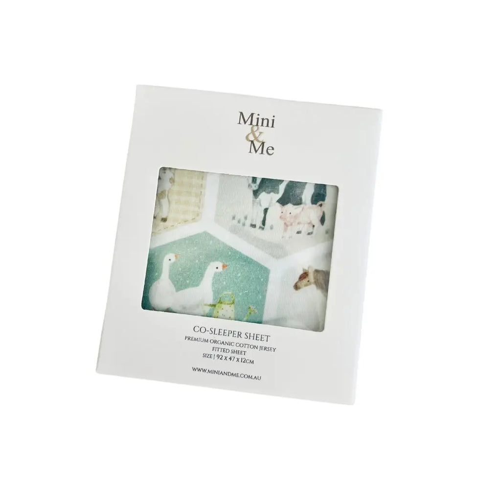 Made from 95% Organic Cotton and 5% Elastane which are perfect for all year-round comfort. Mini & Me Co-Sleeper Sheet Farm Life Features: 92 x 47 x 12cm Tried & Tested - these fit Co-Sleepers, Bassinets, Change Pads and more. 95% Organic Cotton & 5% Elastane Comes with multi-use storage bag Soft, breathable & comfy Care: Cold hand wash. Do not tumble dry.
