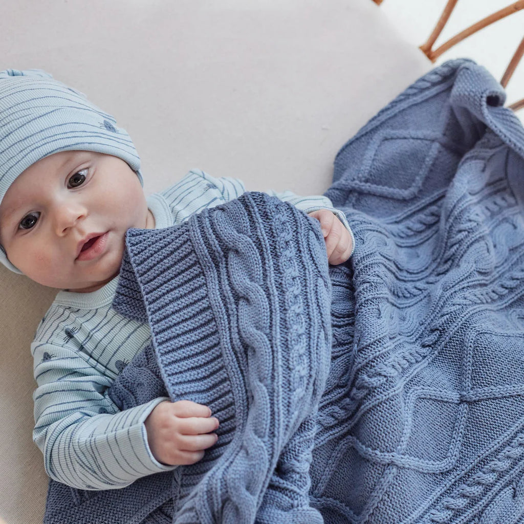 Envelop your little love in our heirloom quality Bluestone Cable Knit Blanket!