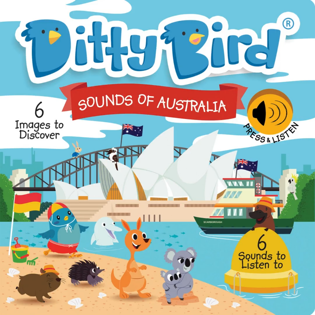 Join Ditty Bird on an exciting adventure through the Land Down Under with Ditty Bird’s Sounds of Australia interactive sound book! Your child will sing, clap, and wiggle along as they discover the wonders of Australia's beautiful landscapes and amazing wildlife, from playful wallabies and cuddly koalas to laughing kookaburras and adorable wombats.