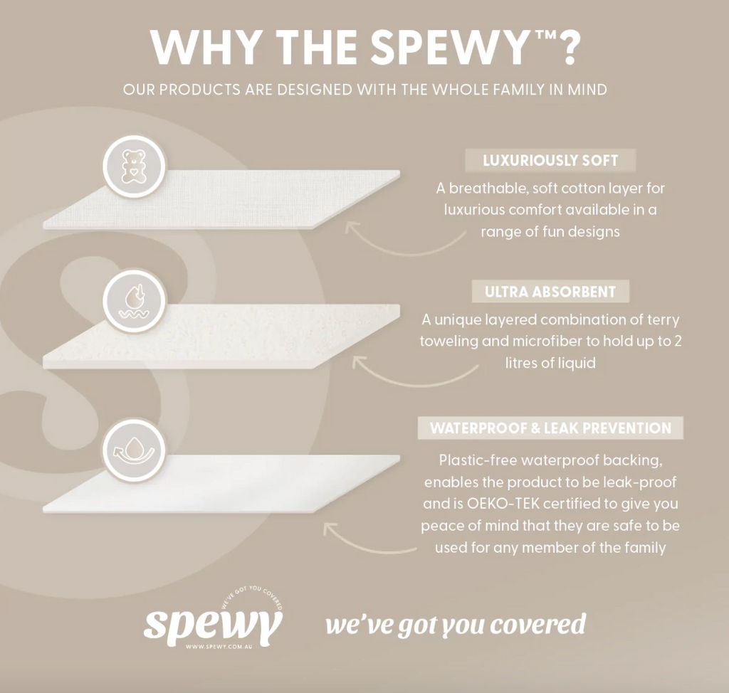We all know that vomit is going to become a part of your parenting duties, whether it be those first milk spits, or true blown gastro. The SPEWY can help take the stress out those situations. With a waterproof backing and able to absorb up to 2 Litres, you can easily throw it in the washing machine and low heat dryer. You can never have too many on hand. Having an emergency one in the car is a MUST.
