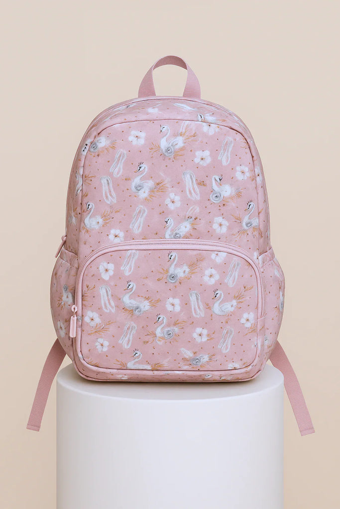 Soft, graceful, and full of charm – our Swan Dancer backpack is perfect for your little ballerina. Adorned with elegant swans, dainty florals, and floating ballet shoes on a blush pink background, it’s designed to twirl through every stage of childhood.