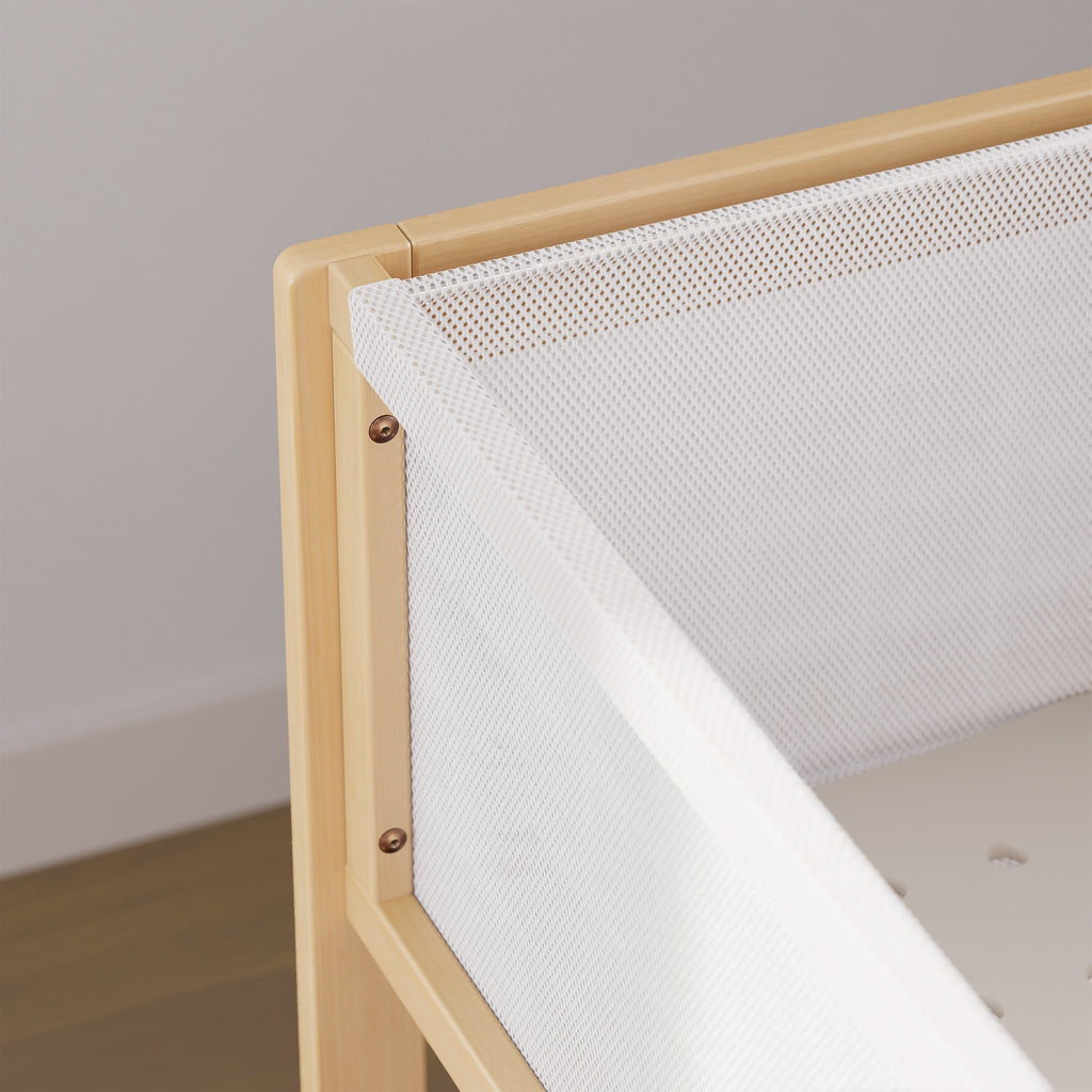 Crafted from sustainably sourced Australian Araucaria and New Zealand Radiata timber, the Tidy Bassinet showcases Boori's durable construction. The base is supported by a sturdy plastic grid, ensuring stability and safety. A highlight of this mesh bassinet is its breathable polyester basket. This design feature allows for maximum airflow and visibility, making it an ideal choice for keeping your baby close during those crucial early stages.