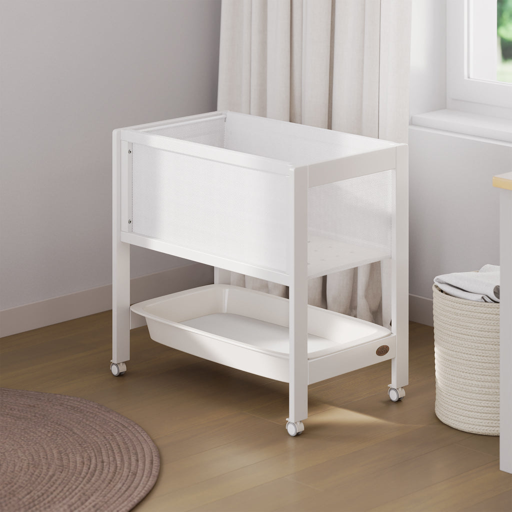The Tidy Bassinet on wheels goes beyond just a sleeping space. Its versatility is unrivalled, thanks to the ergonomically designed Tidy Tray. This hard plastic tray, accompanied by a waterproof polyurethane foam pad, can be placed underneath the bassinet for additional storage or on top to serve as a convenient changing station.